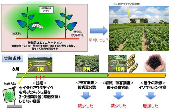 そこで本研究グループは、ダイズ畑の中にセイタカアワダチソウ(雑草)を裁断しネットに入れたものを設置し、生育初期の2週間から3週間のみ草刈りの匂いに触れさせました。