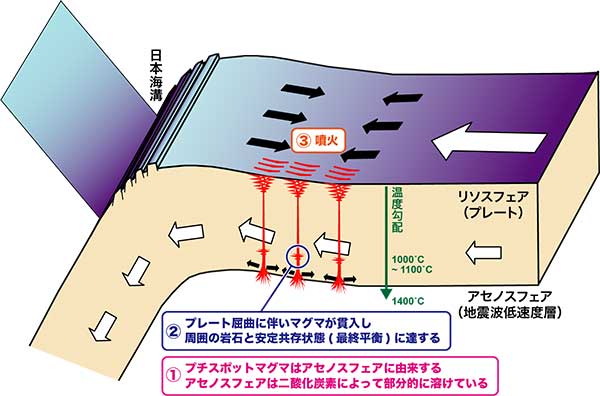 一方、日本近海で発見されたプチスポットの形成モデルによると、プチスポットマグマの上昇はプレート沈み込みに伴うプレートの屈曲に深く関わっており、マグマの供給源はプレートの下のアセノスフェアだろうと予想されました。さらに、プチスポットマグマには二酸化炭素が大量に含まれていることが明らかになりました。