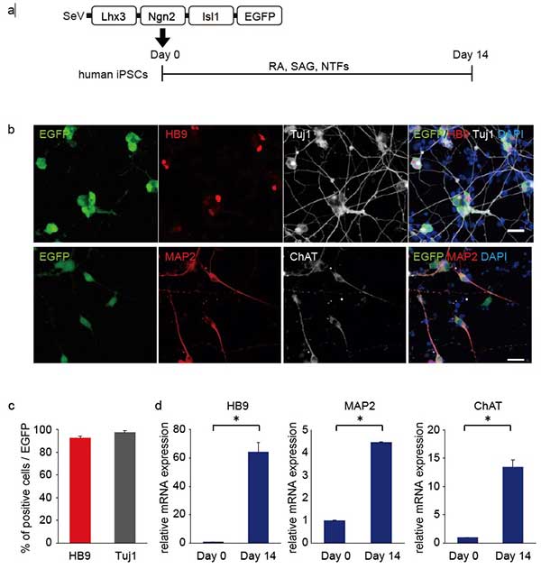 (a)実験の概要図。(b)免疫染色した脊髄運動ニューロンマーカー(HB9、ChAT)とニューロンマーカー(Tuj1、MAP2)。スケールバーは20μm。(c)SeVベクターが導入された細胞における脊髄運動ニューロン、ニューロンの分化効率。(d)分化開始後、Day 0とDay 14における脊髄運動ニューロンマーカー(HB9、ChAT)とニューロンマーカー(MAP2)のmRNA発現解析