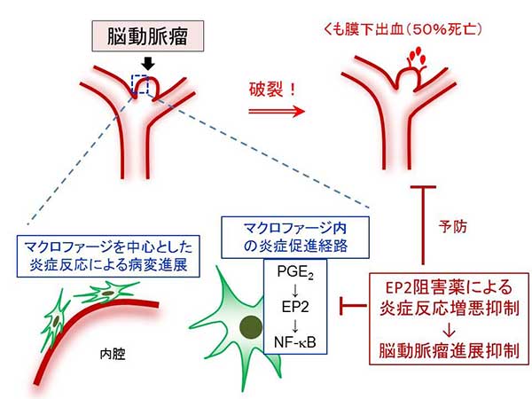 本研究から、脳動脈瘤の形成や進行に重要な役割を持つ炎症反応が、マクロファージに存在するPGE 2 -EP2-NF-κB経路により担われていることが明らかとなりました。また、脳動脈瘤に対する治療薬の標的因子としてEP2が有望であることも分かりました。脳動脈瘤の治療薬の開発は、国民皆保険の恩恵や脳ドックの普及により脳動脈瘤が破裂前の状態で多く発見される我が国が世界をリードできる(すべき)課題であり、我が国発の脳動脈瘤治療薬開発とそれによる「くも膜下出血の無い安心な日本(世界)」の実現をめざし、研究を進めていきたいと考えています。さらに、EP2が脳動脈瘤以外でも癌やアルツハイマー病などでも病態制御を行うことが報告されていることから、EP2阻害薬が開発できるとそれらの疾患に対しての新規治療薬としての応用も期待できます。
