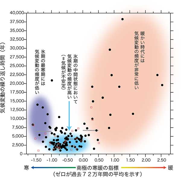 図:南極アイスコアの解析から得られた、過去72万年間における気候変動の繰り返し時間(頻度)と南極の気温との関係(黒丸)。グリーンランドのアイスコアによる最終氷期の結果も示す(赤四角)。間氷期のような暖かい時代や、氷期の最寒期のような寒い時代には頻度が低いが、氷期の中間的な寒さの時代に気候変動が頻繁に起こっており、気候が不安定であったことが示された。