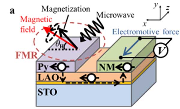 2DEGが形成されている層の上に強磁性電極としてNiFe(Py)を、スピン輸送信号の計測のために非磁性電極(NM)を一定の距離を離して形成している。NMには白金(Pt)など重い元素を用いる。室温でこのPyに強磁性共鳴と呼ばれる現象を誘起すると、LAO/STO界面の2DEGにスピン角運動量が注入される。