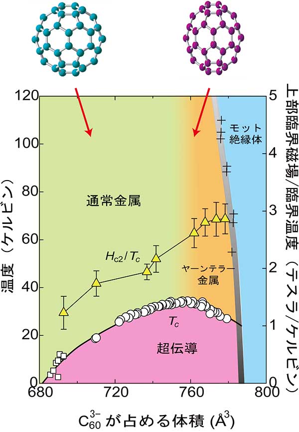 C60分子1個あたりの占める体積(横軸、C60分子間距離)に対する温度(縦軸左側)および上部臨界磁場(縦軸右側、上部臨界磁場/臨界温度)の相図。高温において、格子体積が小さい場合には分子ひずみのない通常金属状態となり、体積を大きくしていくと分子がひずんだ異常金属状態(ヤーン-テラー金属状態)となる。さらに体積が大きい状態では分子のひずんだモット絶縁体状態である。ヤーン-テラー金属状態においては、高い転移温度(約30ケルビン)および上部臨界磁場(約90テスラ)の状態が実現する。