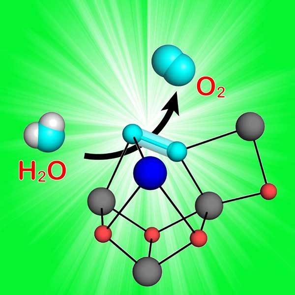 図:今回SACLAのX線自由電子レーザーで解析した光化学系 II 複合体(PSII)に含まれる水分解触媒の立体構造。「ゆがんだイス」のかたちをした触媒に水分子が取り込まれた瞬間を捉えている。水色の部分が今回明らかにされた酸素分子が発生する部分