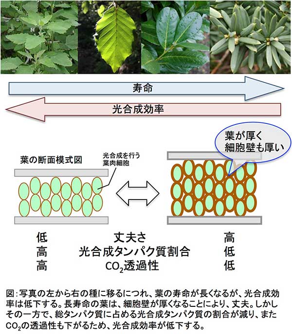 私たちの身の回りには、道脇の雑草から、冬に葉を落とす落葉樹、通年葉をもつ常緑樹など、多種多様な植物がいます。一般的に、長生きの葉ほど厚く、光合成を行う組織もたくさんもっていますが、光合成速度は高くありません。つまり「長生きの葉ほど光合成の効率が低い」といえます。これは世界共通のルールですが、その原因は謎のままでした。