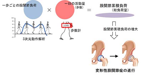 建内宏重 医学研究科助教、市橋則明 同教授らの研究グループは、患者一人一人の歩き方の違いに影響される一歩ごとの股関節への負荷と、日常生活や仕事による一日の活動量(歩数)とを掛け合わせた新たな指標である「股関節累積負荷」を考案し、変形性股関節症の進行との関係を調査しました。その結果、股関節累積負荷の増大は、変形性股関節症の進行に関わる重要な要因であることが明らかとなりました。