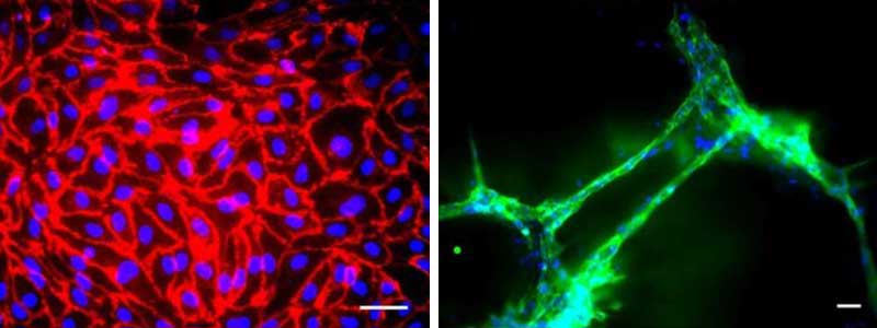 (左)ヒトiPS細胞から高効率内皮細胞誘導(赤:VE-カドヘリン(内皮細胞)、青:細胞核)