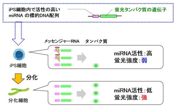 本研究グループは、ヒト多能性幹細胞で高い活性を示すmiRNAに反応するDNA配列と、目印となる蛍光タンパク質を作る遺伝子を、非ウイルス性のベクターを用いてiPS細胞に導入しました。