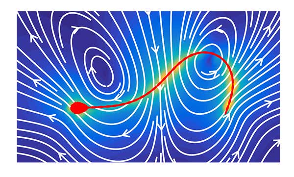 生命の誕生はひとつの精子と卵の出会いからはじまります。しかし、その前に精子は他の多くの精子たちとの「競争」に勝たなければならない・・・この精子の旅の物語はどこまでが本当なのでしょうか。本研究グループは、精子の泳ぎに周りの液の流れを表す式からアプローチすることで、精子の旅を覗いてみたいと考えました。
