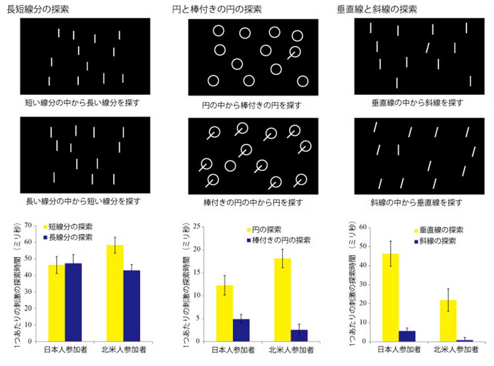 思考や推論、モチベーションの影響を可能な限り除くために、文化的に中立な幾何学図形(長短の線分、円と棒付きの円、垂直線と斜線)を用いて課題を行ったところ、一貫して、脳の視覚野の中でも比較的低次で扱われる特徴(傾きなど)に関する探索非対称性は北米の調査のほうが小さく、高次な視覚野で扱われる特徴(長さや線の組み合わせなど)に関する探索非対称性は日本人のほうが小さく見られました。この結果は、一見文化とは無関係に思われる極めて単純な刺激にも文化差があることを示しており、初期の視覚情報処理過程が環境によって変化する可能性を示唆しています。