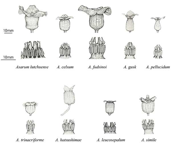 図:奄美群島に生育する9種のカンアオイの花形態(上:外観図、下:雄しべと雌しべ)