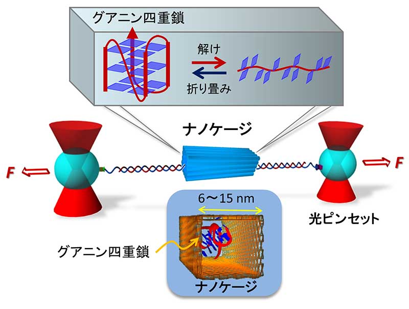 本研究グループは、生体分子の立体構造の形成に、分子が置かれた空間の広さがもたらす影響に着目しました。「DNAオリガミ」と呼ばれる、DNA鎖を折り曲げてナノスケールの構造体を作る手法で作成した数ナノメートルのさまざまなサイズの角筒状の構造体(ナノケージ)を用い、その中にグアニン四重鎖構造を配置することで、ナノ空間に閉じ込められた分子を再現しました。分子を空間的に操作できる光ピンセットを用いて、グアニン四重鎖構造を両方向から引っ張ることで、その構造がほどけたり、再び折り畳まれたりする過程を1分子レベルで測定しました。