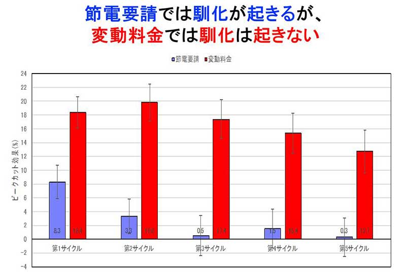 節電を勧める働きかけ方によって節電効果が持続するかどうか分析したところ、初回の夏期の節電要請は8%の効果があったものの、すぐに効果が落ち、馴化(介入に慣れて効果が減衰すること)していることが分かりました。他方で、変動型電気料金を導入すると一貫して17%の効果が持続しました。
