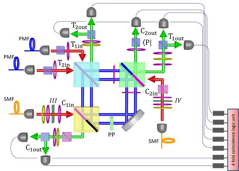 この問題に対し、Fiurasek(フューラセック)らは、2008年に光の干渉計を組み合わせた独自の提案で、従来の500倍以上の効率(162分の1)で、制御スワップを実現する方法を理論的に提案しました。しかし、この方法を実現するには、非常に複雑な光干渉の長時間安定化など技術的な困難が多数存在し、これまで実現していませんでした。また最近、オーストラリアのグループにより制御スワップ操作の実現が報告されましたが、これは外部からの光量子ビットの入力が不可能であり、光量子回路をはじめとする様々な応用にそのまま用いることはできませんでした。
