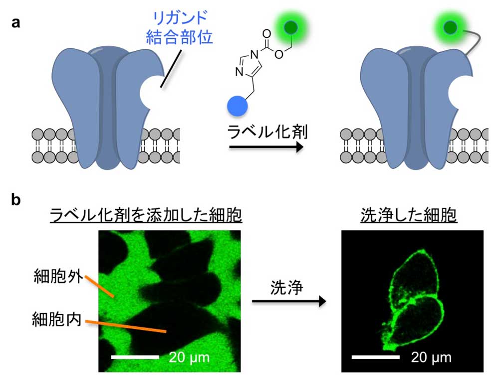 - 細胞表面の受容体だけを蛍光標識する有機化合物を開発し、これまで観察が困難だった脳深部にある受容体も可視化できた。