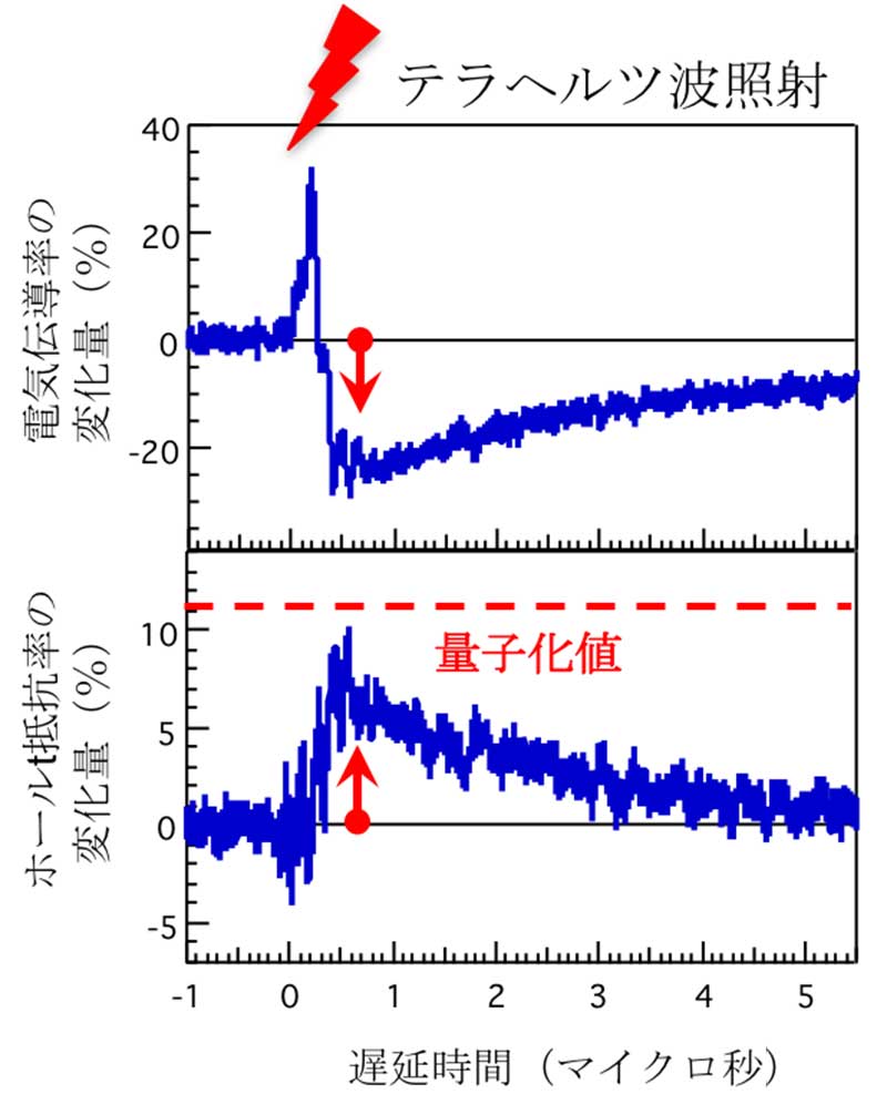 図:テラヘルツ波照射による電気伝導率の変化とホール抵抗率の変化。上のグラフの電気伝導率が減少している間、下のグラフのホール抵抗率が量子化値に戻る様子が観測されている。