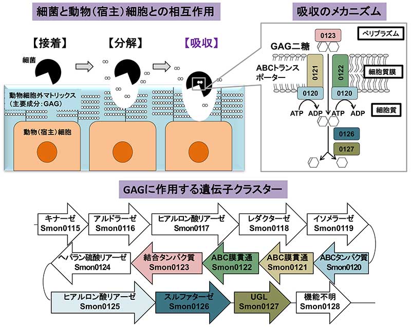 そこで本研究グループは、ヒトに共生または感染する細菌のゲノムを対象にGAG遺伝子クラスターを解析しました。その結果、鼠咬症を引き起こすグラム陰性連鎖桿菌の遺伝子クラスターに、GAGの分解と代謝に関わる複数の酵素とともに、基質結合タンパク質依存ABCトランスポーターがコードされていることを見出しました。そこで、連鎖桿菌のGAG分解性、基質結合タンパク質の構造機能相関、およびABCトランスポーターの機能を解析し、断片化GAGを細胞内に取り込む細菌の分子装置の実体を明らかにしました。