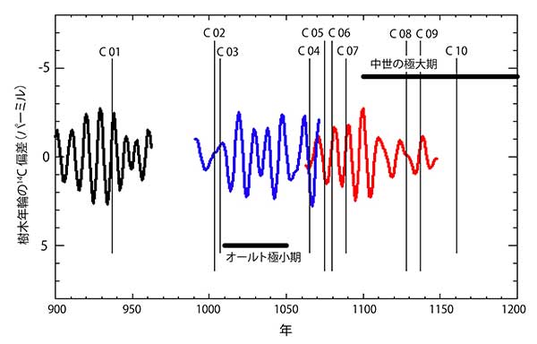 図:樹木年輪から復元された太陽活動の変化(黒・青・赤のグラフ。色は分析に用いられた樹木の違いを表す)。C01からC10の縦線は、中国で長引く赤いオーロラが見られた日を示す。また、太陽活動が長期間にわたり低下した「オールト極小期」、長期間にわたり激しくなった「中世の極大期」の年代も示した。