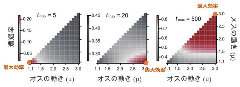 図:相互探索シミュレーションの結果。色が赤い部分が高い遭遇率を示す。制限時間( t max )が中間のとき、性的に異なる動きをするペアが、遭遇率を最大化できる。