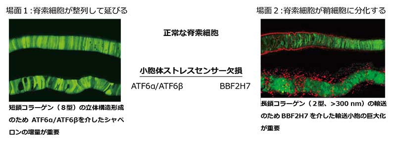 以上より、正常なメダカでは、液胞化の段階で2型コラーゲンを取り込むために、小胞体ストレスセンサーBBF2H7が活性化され、必要な遺伝子の発現量をまとめて上昇させることによって巨大化した輸送小胞をたくさん作り、2型コラーゲンを細胞外に運んで鞘を形成させていることが分かりました。