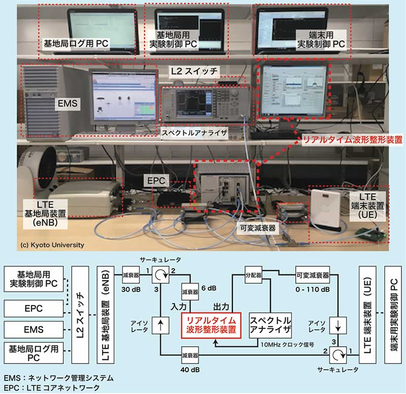 水谷圭一 情報学研究科助教、松村武 同特定准教授、原田博司 同教授らの研究グループは第5世代移動体通信(5G)システム向けの新しい通信方式である、UTW-OFDM方式(ユニバーサル時間軸窓直交周波数分割多重方式)の実証実験に世界で初めて成功しました。本実証実験により、現行の第4世代移動体通信(4G)システムLTE/LTE-Advancedで問題となる帯域外輻射(無線周波数の利用効率劣化の要因となる割り当てチャネル帯域外への漏洩電力)を、簡単な信号処理の追加のみで大幅に抑圧できることが実証され、移動通信に適した周波数(6GHz以下)において、これまで以上に高密度な周波数利用や、5Gが目指す超多数端末の同時接続やチャネルあたりの通信速度の向上が期待できます。