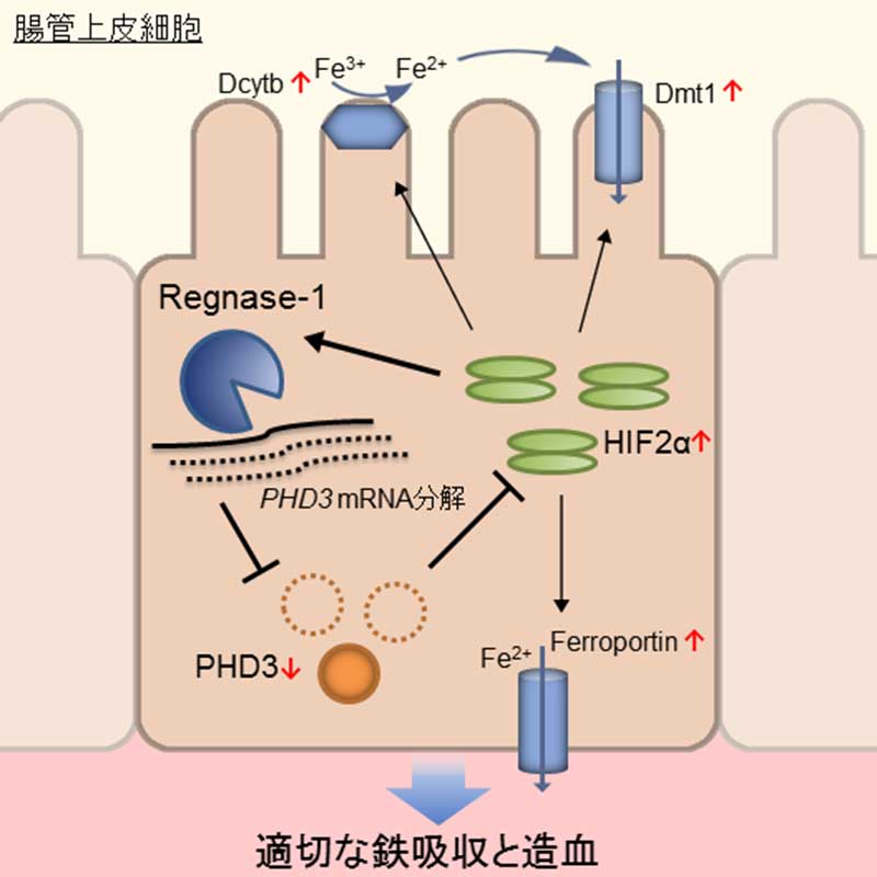 本研究グループは、鉄代謝にかかわるタンパク質のなかでトランスフェリン受容体(体内で鉄イオンの輸送を担うトランスフェリンに結合した血中の鉄を、細胞内に取り込むための受容体)とPHD3(腸での鉄吸収にかかわる遺伝子の転写を活性化することが知られている、転写因子HIF2αの分解を誘導する酵素)のmRNAを、Regnase-1が分解することを解明しました。また、Regnase-1はPHD3のmRNAを分解することでHIF2αを安定化させ、腸管での鉄吸収を促進する役割があることを明らかにしました。さらに、Regnase-1自身がHIF2αの標的遺伝子であり、Regnase-1、PHD3、HIF2αの三者からなる正のフィードバック機構が腸管での鉄吸収を調節していることを発見しました。
