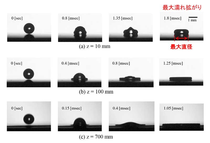 それぞれの落下開始地点の高さは、(a)z=10mm、(b)z=100mm、(c)z=700mm。高さが高い(速度が大きい)ほど最大濡れ拡がり面積は大きくなる。