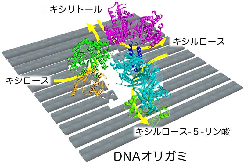 さらに、新たに開発したモジュール型アダプターを利用して、キシロースからキシリトール、キシリトールからキシルロース、そしてキシルロースからキシルロース-5-リン酸への代謝反応を触媒する3種類の酵素を並べた「分子コンビナート」を構築しました。