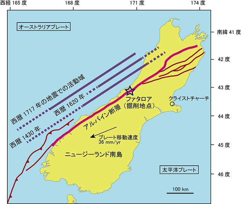 ニュージーランド南島西海岸のアルパイン断層は、平均約300年の間隔で大地震を発生させている活動度の高い断層で、最近では1717年に活動しています。アルパイン断層における次の地震発生時期が近いこと、隆起速度が速いことから、深部における地震発生過程の理解に都合がよいため、ニュージーランド南島西海岸のファタロア川(Whataroa River)で、断層掘削計画「アルパイン断層深部掘削プロジェクト(Alpine Fault, Deep Fault Drilling Project:DFDP)」が2014年に行われました。