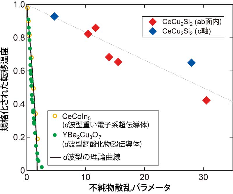図:縦軸を超伝導転移温度の抑制割合、横軸を不純物が超伝導電子ペアを「壊す」強さを表すパラメータとしたときの図。CeCu 2 Si 2 では他の新奇な超伝導体と比べて超伝導転移温度が抑制されにくいこと、つまり不純物によって超伝導電子が壊されにくいことを示している。