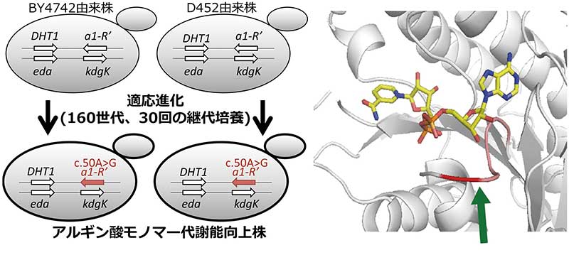 2種類の代謝改変酵母の適応進化(160世代まで、30回までの継代培養)の結果、ともにアルギン酸モノマー還元酵素遺伝子( a1-R ’ )の同じ箇所に変異が入った(左図)。その結果、同還元酵素(A1-R’)のNAD(P)H結合部位近傍の矢印箇所(右図)のグルタミン酸残基がグリシン残基に置換され、同酵素活性が上昇し、代謝改変酵母株のアルギン酸モノマーの代謝能が向上した。アルギン酸モノマーを資化できる代謝改変酵母を新たに構築する際、もう煩雑な適応進化をしなくても済む。