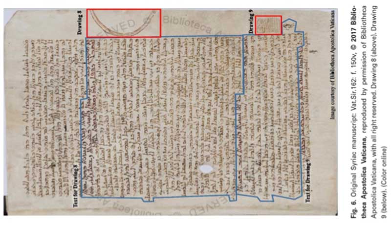 図:シリア語写本MS Vat.Sir.162に見える771/772年のオーロラ図像(MS Vat.Sir.162, f. 150v.)。年代記作家本人の直接観測による最古の図像と言える。前出の「さかさまの弓」という記述から、図の向きは該当の写本のフォリオを横倒しにしたものであることが分かる。MS Vat.Sir.162 © 2017, Bibliotheca Apostolica Vaticana, reproduced by permissions by Bibliotheca Apostolica Vaticana, with all right reserved.