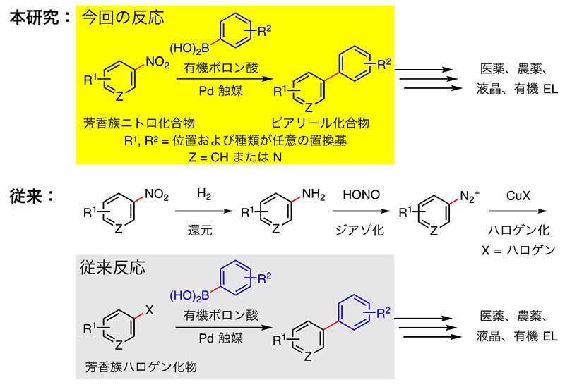 今回開発した芳香族ニトロ化合物の鈴木-宮浦クロスカップリング反応は、従来有機ハロゲン化物を用いて行われている化学プロセスに取って代わって、さまざまな医薬、農薬、液晶、有機EL材料の工業的製造プロセスに応用できる可能性があります。また、今回開発した炭素-炭素結合形成だけでなく、鍵となる芳香族炭素-ニトロ基結合の切断反応を利用して、炭素-窒素、炭素-水素、炭素-フッ素結合形成などの新反応への展開も期待できるため、多置換芳香族化合物の合成プロセスを刷新できる可能性も秘めています。