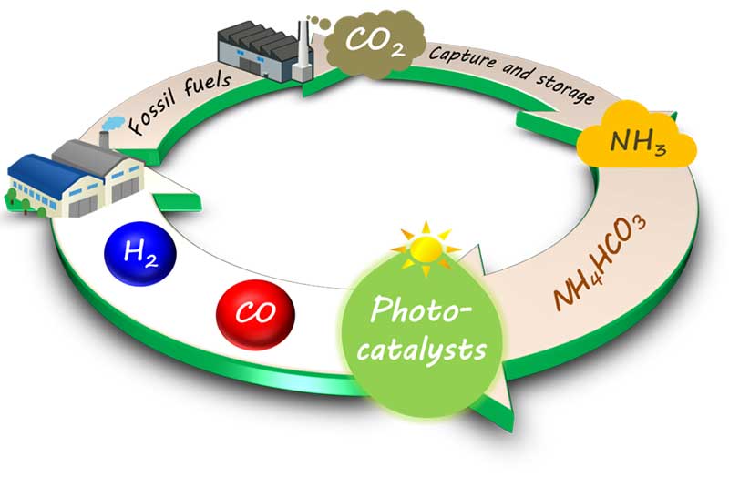寺村謙太郎 工学研究科准教授、田中庸裕 同教授らの研究グループは、アンモニアを電子源として二酸化炭素(CO 2 )を光還元し、一酸化炭素(CO)を取り出す反応に高い活性を示す光触媒群を発見しました。CO 2 を光還元する場合には同時に水も光還元されますが、今回発見した触媒を用いると水の光還元はほぼ進行しないため、CO 2 から一酸化炭素のみを得ることに成功しました。アンモニアからは無害な窒素のみが生成するため、常温・常圧条件下で水素と一酸化炭素の合成ガスを容易に得る方法として期待が持てる手法です。