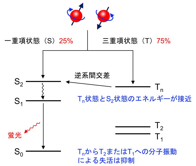 今回本研究グループが提案した発光機構は、これまで発光には利用できないとされて来た電子状態を利用するものです。提案された設計指針により、第二世代のEL機構であるリン光EL材料で必要とされるような希少金属は必要ではなく、過去に検討されてきたものよりも広い範囲の分子が高効率で発光する分子の候補となり得ます。第三世代のEL機構である熱活性型遅延蛍光(TADF)で指摘されている、青色発光が難しい、色純度が悪いといった問題も解消される可能性を持つ発光機構です。