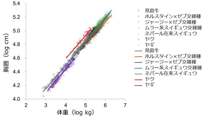 本研究グループは、日本やネパールの生産現場で収集したウシ科家畜7種類の体重と胸囲の測定値をアロメトリー式にあてはめ、式のパラメータ(アロメトリー式は、両辺の対数を取ることで、logY=log a b logXという線形の関係が得られる。 b は傾き、log a は切片というパラメータ)を種間、種内品種間で比較しました。
