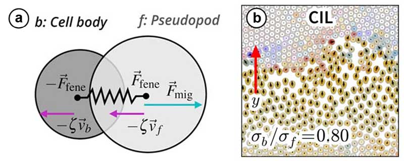 図:(a) 自走する細胞をバネでつながった二つの円盤でモデル化し、細胞の伸び(円盤間の距離)に依存した推進力を導入することで接触阻害(Contact inhibition of locomotion、CIL)を取り入れる。
