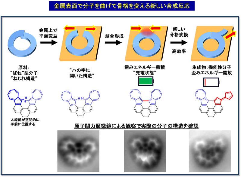 図:今回開発した「金属表面で分子を曲げて骨格を変える新・有機合成法」の概念図。下段に、実際に測定した分子の原子間力顕微鏡像を示す。