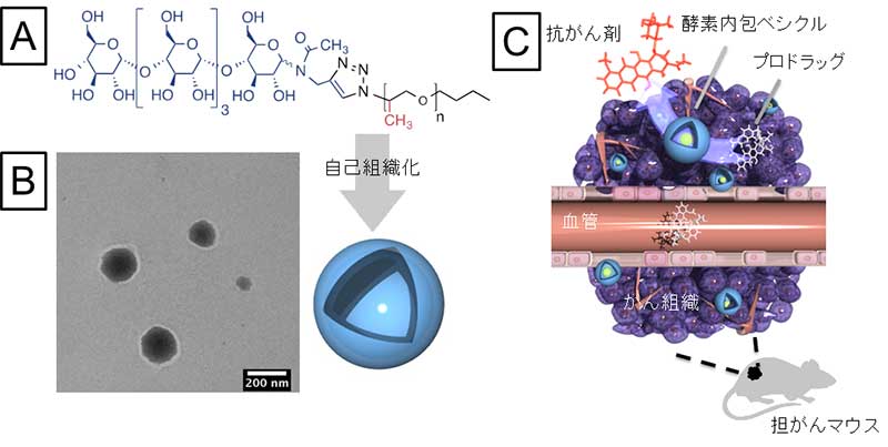 本研究グループは、糖鎖とポリプロピレングリコールからなる両親媒性ポリマーが形成する糖鎖高分子ベシクルが、分子量の違いによって選択的に物質透過性を示すことを発見し、また、酵素を安定に封入し、内部に安定に保持できることを明らかにしました。この酵素封入ベシクルは、外部から基質を内部の酵素に供給でき、酵素反応生成物を外部に放出できる機能を持つことを見いだしました。さらに、このベシクルは血中投与により生体内のがん組織周囲に集まり、プロドラッグを抗がん剤へと変換し、優れた抗腫瘍効果を示すことをマウスで実証しました。