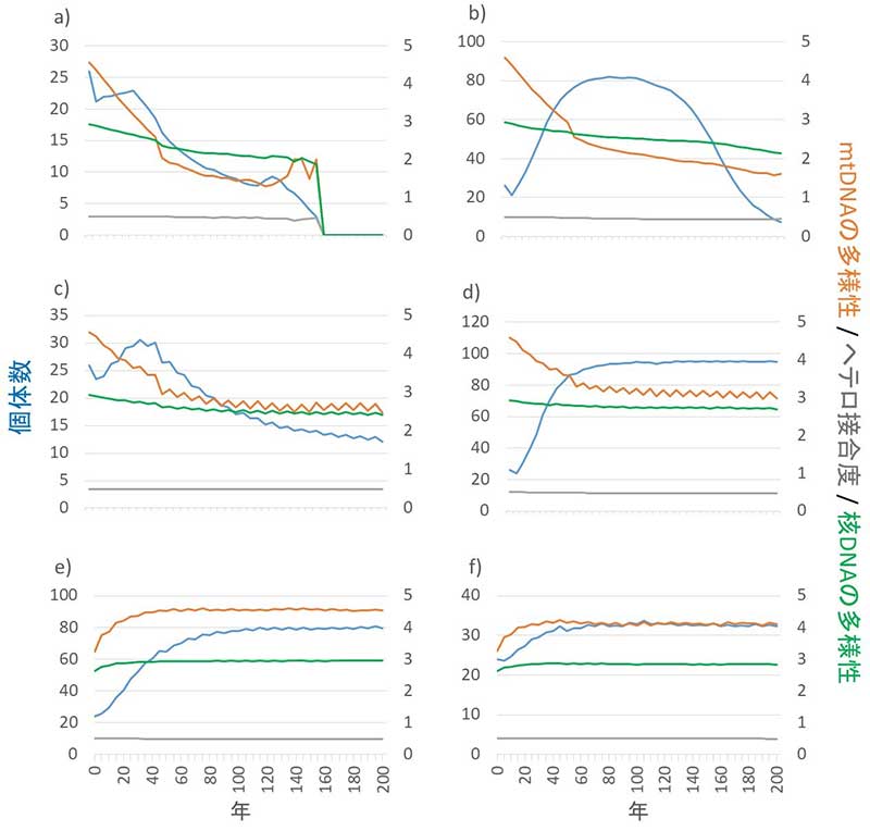 絶滅を避ける条件を検討した結果、繁殖参加つがい数を3つがいから6つがいに増やすこと、野生から新規に2個体が10年に1度の間隔で加入することを組み合わせた場合に、200年後も100羽付近で安定して存続すると推定されました。また対策を取った場合の遺伝的多様性減少は、100年後にはミトコンドリアDNA32.8%、核DNA7.8%、200年後にはミトコンドリアDNA34.9%、核DNA9.2%に留まりました。