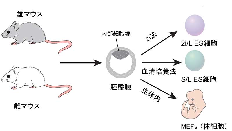 マウスを交配させて雌雄複数の胚盤胞を得、それぞれの内部細胞塊からES細胞を作製した。