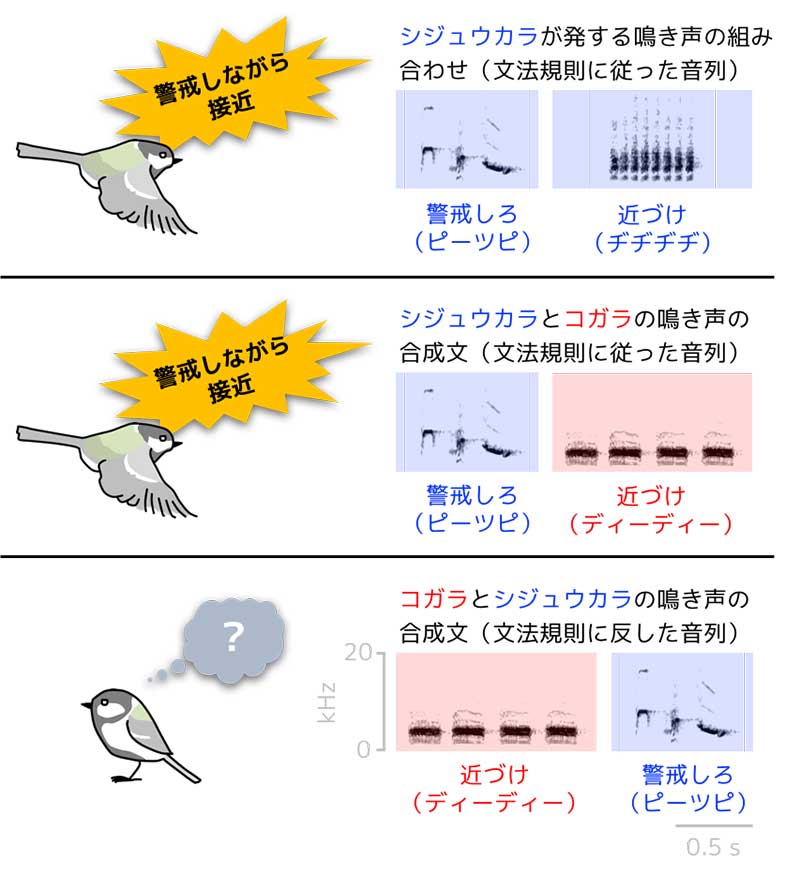本研究グループは、同種・他種の鳴き声から合成した人工的な音列を聞かせることで、シジュウカラが初めて聞いた文章であっても文法構造を正しく認識し、単語から派生する文意を理解する能力をもつことを明らかにしました。