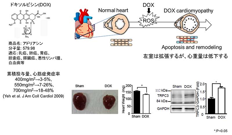 アントラサイクリン系抗がん剤ドキソルビシン(DOX)の累積投与が心筋症発症リスクを高めること、心筋細胞死が起こる前段階で心筋萎縮が起こることが知られている。本研究グループはDOX投与マウス心臓で心重量の減少と逆相関的にTRPC3やNox2タンパク質の発現量が増大することを発見した。TRPC3-Nox2タンパク質の発現増加を抑制することで、DOX誘発性の心筋萎縮とそれに伴う心機能低下が抑制されることを明らかにした。