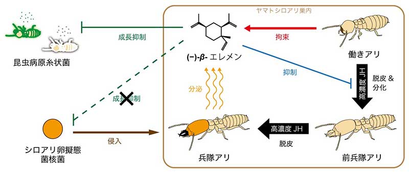 図:本研究で明らかとなった兵隊フェロモンの機能の概念図。兵隊アリ特異的に分泌される(−)- β -エレメンは、働きアリから前兵隊アリへの分化を抑制する。一方で、兵隊アリは自力で餌を食べたり、グルーミングしたりすることができないため、働きアリに世話してもらう必要がある。その際に(−)- β -エレメンを分泌して働きアリを呼び止めると考えられる。さらに、(−)- β -エレメンは昆虫病原糸状菌の成長も抑制する。ただし、(−)- β -エレメンはシロアリ卵擬態菌核菌の成長を止めることはできないことから、シロアリ卵擬態菌核菌は(−)- β -エレメンに対して耐性を持っていることが示された。