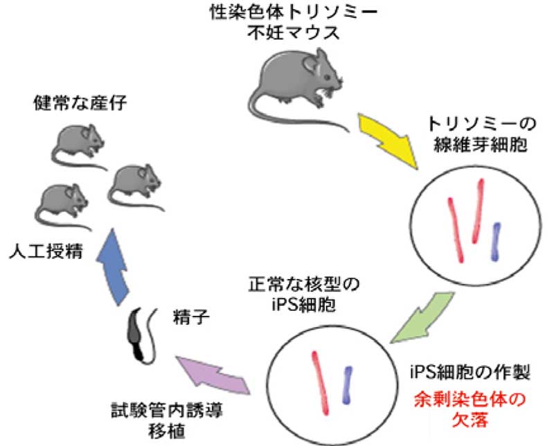 今回実験に用いたマウスは、性染色体トリソミーXXY及びXYYを持ち、それぞれクラインフェルター症候群(男性の性染色体にX染色体が一つ以上多いことで生じる一連の症候群)とダブルY症候群(正常男性核型がXYであるのに対し、XYY、XYYYなどY染色体が過剰であることによる症候群)のモデルとなるマウスで、どちらのマウスも精子を作れません。