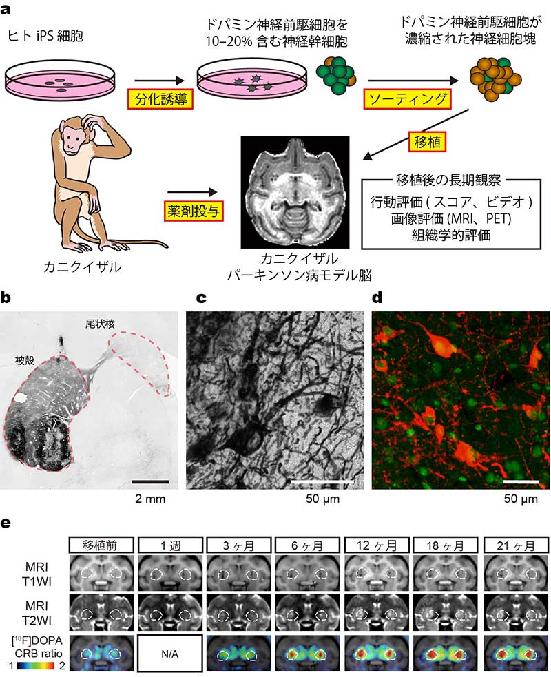 - 移植したヒトiPS細胞由来ドパミン神経前駆細胞が脳内に生着し機能していることを、MRI(核磁気共鳴画像法)とPET(陽電子放出断層撮影)および脳切片の組織学的解析によって確認した。
