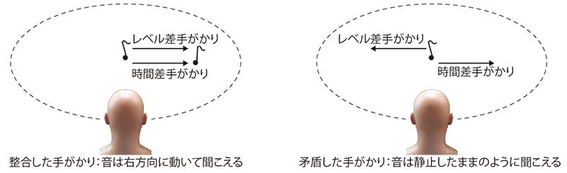 音源が右に動くとき、音波は左耳より右耳に早く到来し(時間差手がかり)、同時に頭による遮蔽効果によって右耳により大きく音が入ります(レベル差手がかり)。通常は、この二つの手がかりは矛盾することなく、私たちはそれによって音源の位置をある程度正確に判断することができます。しかし、実験的操作によって、互いに矛盾する方向に二つの手がかりを聞かせると、音像は、一般に右でも左でもなく、正面に知覚されます。脳内では多段階での情報処理が行われており、二つの手がかりに関する聴覚情報がどのように扱われているか、いまだに解明されていません。