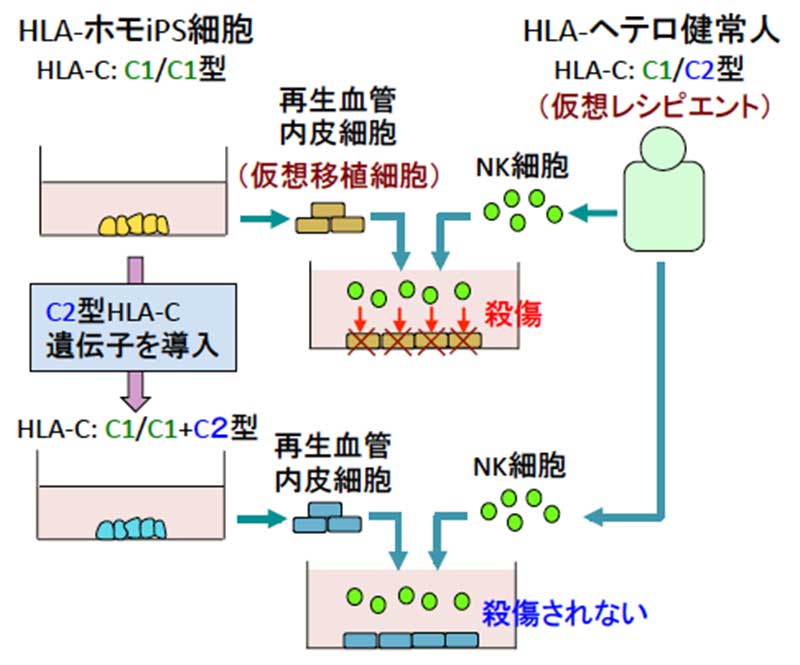 HLA-ホモでHLA-CについてはC1/C1型のiPS細胞から血管内皮細胞を再生した。一方、HLA-ヘテロでHLA-CについてはC1/C2型の健常人からNK細胞を採取した。両者を反応させると、18時間後には再生血管内皮細胞はNK細胞によって殺傷された。このような組み合わせの移植では、移植片がNK細胞の攻撃を受ける可能性を示している。iPS細胞にC2型のHLA-C遺伝子を導入して再生細胞にC2型のHLA-Cを出させると、殺傷されなくなった。この方法は移植片に対する免疫反応の抑制に応用できると期待される。