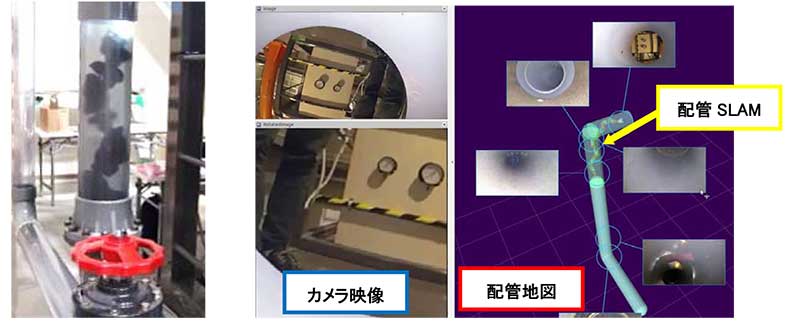- 音響センサによる配管内距離情報、慣性センサ(物体の運動を司る3軸の角度(姿勢)と加速度を検出する装置)からの進行方向情報、多関節モデルによる姿勢推定情報を組み合わせて、精度良くロボットの位置を推定し、同時に配管のマップを作成できる技術(統合型SLAM(自己位置決定と配管地図の同時生成))を開発