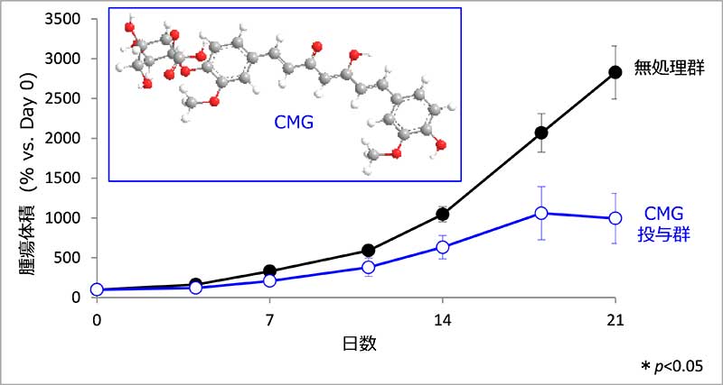 化学合成したCMGをラットに静脈投与した際に、これまでのクルクミン原体などの経口投与と比較して、クルクミンが極めて高い血中濃度を示すことを明らかにしました。さらに、ヒト結腸腺癌細胞を移植したマウスモデルにおいて、CMGは体重減少や肝障害などを伴うことなく、顕著な抗がん活性を示すことも明らかにしました。したがって、CMGは安全性の高い抗がん剤などとしての実用化が期待されます。